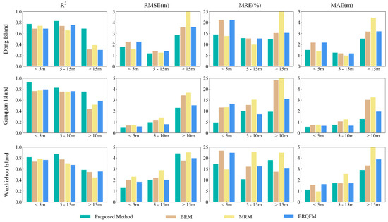 The performance of the different methods is further verified by comparing and analyzing the inversion results for different bathymetric intervals. Figure 15 shows four indicators (R2, RMSE, MRE, and MAE) of the bathymetric inversion results for Dong Island, Ganquan Island, and Wuzhizhou Island in different bathymetric intervals. In particular, the thresholds are based on the maximum water depths of the corresponding areas to ensure that the accuracy assessment of the different water depth intervals is validated by a sufficient and uniformly distributed amount of in situ data. In general, the proposed method has a relatively lower RMSE, MRE, and MAE in all study areas with different water depths and relatively higher R2 compared with other methods. With increasing water depth, the four methods show a declining effect overall, indicating that the performance of these bathymetric approaches has a negative relation to water depth. This happens more obviously in the deep-water zone (>15 m or >10 m, specifically on Wuzhizhou Island), which is most likely due to the poor performance of ICESat-2 in the deep-water area. We assert that the reasons for the suboptimal experimental results in the deep-water area of Wuzhizhou Island are as follows: (1) compared to the other two study areas, the more complex terrain of Wuzhizhou Island leads to a higher inversion difficulty and (2) the lower photon penetration rate of ICESat-2 in deep-water areas results in relatively fewer sample photon points acquired during actual experiments. However, given that the overall area with water depths exceeding 15 m in the Wuzhizhou study region accounts for a relatively small proportion and considering that the experimental accuracy of our method remains superior compared to other approaches, this issue has not significantly impacted the primary conclusions of this study.