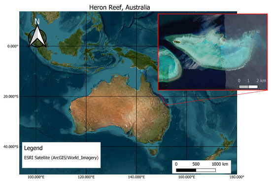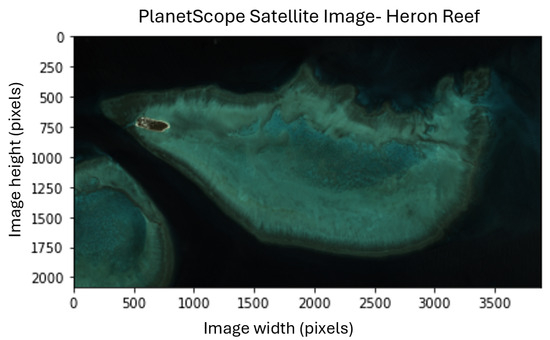 Planet, with its mission to “image the Earth every day,” collaborates with businesses, governments, and research institutions to harness satellite data for addressing global challenges. The company’s PlanetScope satellite constellation, consisting of approximately 120 satellites, captures multispectral images with a high spatial resolution of 3 m pixels. These images are captured as continuous strips of individual frames that are stitched together to form seamless scenes. With hundreds of satellites orbiting the planet approximately every 90 min, Planet provides near real-time global coverage. For this study, we utilized a PlanetScope Scene (PSScene) from October 2018 over Heron Reef (S. Lat., E. Lon.), located at the southern end of the Great Barrier Reef, Queensland, Australia (Figure 2) [24]. The scene contains four multispectral bands: blue, green, red, and near-infrared (NIR). This date was selected as it closely aligned with the ground truth data collection period. The delivered PSScene was provided as Analytic Surface Reflectance, which Planet orthorectified, calibrated, and atmospherically corrected. The reflectance values were scaled by a factor of 10,000, such that the raw data range from 0 to 10,000 corresponds to a physical surface reflectance of 0–1 [25]. Using the NIR band, the image was assessed for sunglint, but the correction was determined to have minimal effect; therefore, no further adjustments were applied.