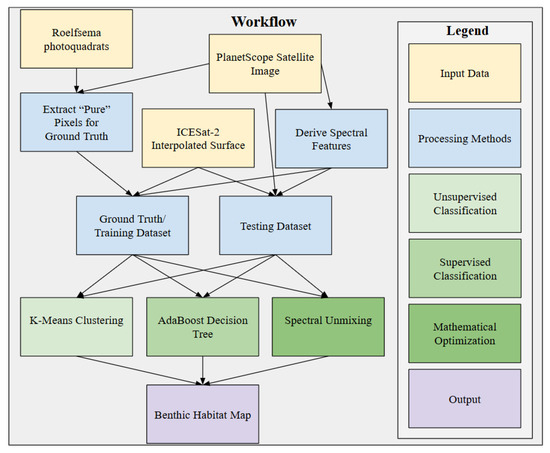This section describes the machine learning (ML) and mathematical unmixing approaches explored in this article to estimate benthic composition from high-resolution multispectral satellite imagery. The workflow for data processing and methods is shown in Figure 4. The inputs to this workflow included a PlanetScope satellite image, Roelfsema et al. photoquadrats, and an ICESat-2 interpolated surface derived from terrain metrics previously used to classify coral presence [23]. The Roelfsema et al. photoquadrats, spatially aligned with satellite image pixels, were used as a ground truth dataset containing benthic class labels, percent cover for each class within a m area, and associated spectral values. Additional variables were incorporated into both the ground truth dataset and the PlanetScope raster image by deriving spectral features and introducing the ICESat-2 interpolated surface, composed of algorithmically derived terrain metrics. Three modeling approaches (K-Means clustering, AdaBoost decision tree, and mathematical spectral unmixing) were examined to map benthic habitats. These models were trained using the labeled ground truth dataset and then applied to the full processed raster image to generate benthic composition predictions across the study area. The following sections elaborate on each stage of the workflow.