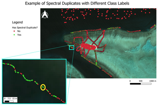 To better understand potential sources of classification error in the ground truth data, we investigated the consistency of spectral signatures across benthic class labels. Specifically, we conducted a systematic pairwise comparison of PlanetScope reflectance values across all four bands to identify pixels with identical spectral values. We then examined instances in which these spectrally identical pixels were assigned different benthic class labels. Approximately of ground truth pixels shared duplicate spectral values with at least one other pixel, but were labeled differently. An example is shown in Figure 5, where two pixels with identical spectral values (circled in yellow) are labeled as dead coral (top) and live coral (bottom). These inconsistencies were most frequently observed among live coral, sand, and dead coral classes. This analysis highlights the spectral ambiguity between certain benthic types and underscores the challenge of reliably distinguishing them using spectral data alone.