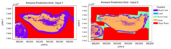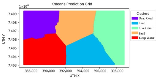 An unsupervised implementation of K-Means was initially tested on the satellite imagery, where the algorithm was applied without any prior knowledge of the underlying classes. However, this approach resulted in poor classification performance, as the algorithm tended to divide the geographical region into K spatially uniform clusters rather than distinguishing meaningful spectral differences between coral reef features (Figure 6).