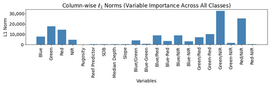 We also measured feature importance to gain an understanding of which variables most strongly influenced the model’s ability to correctly classify benthic composition. Feature importance was calculated as the Gini importance, which quantifies the contribution of each feature in reducing impurity within the model [44]; higher scores indicated greater importance.