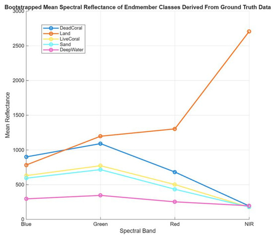 The benthic labels in Roelfsema et al.’s dataset were more specific than our broader endmember classes. To align them, we mapped each detailed benthic label to its corresponding endmember. For example, “encrusting Montipora” was categorized as live coral, whereas “bleached encrusting Montipora” was assigned to dead coral. Although bleached corals remain biologically alive, the loss of symbiotic pigments substantially increases their reflectance and reduces spectral contrast, making them optically similar to dead coral, sand, or coral rubble in multispectral imagery [32,33,34]. Because this classification was based on optical rather than physiological differences, bleached encrusting Montipora were grouped with dead coral to reflect this spectral similarity. Roelfsema et al.’s photoquadrats did not include examples of land, and only 11 deep water points were available from their survey. To better incorporate these classes, shapefiles were generated using QGIS (a free and open source GIS software [35]) to delineate regions containing only land or deep water. From each shapefile, a random sample of 300 points was selected to serve as pure pixels for these two endmembers, resulting in 300 points for land and 311 for deep water.