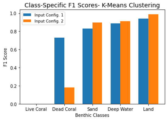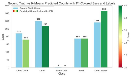 K-Means clustering classified sand and dead coral with high F1 scores and small differences between predicted and actual pixel counts. Land was classified with near-perfect accuracy (F1 ). Deep water was also reasonably well predicted, with a moderate difference in pixel counts and a high F1 score. However, live coral was poorly classified, receiving an F1 of 0 despite a small difference in pixel counts. We believe this is a reflection of class sparsity rather than model failure.