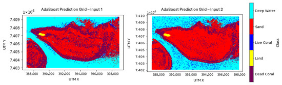 To enhance classification performance, we supplemented raw PlanetScope bands with derived features, including band ratios and differences, inspired by established remote sensing indices. These features improved results across all models. Incorporating ICESat-2 metrics yielded mixed results depending on the model, demonstrating the potential value and limitations of including seafloor-surface metrics. Recall that the AdaBoost model achieved a global accuracy of when trained on spectral and derived spectral data, and when trained using spectral, derived spectral, and ICESat-2 derived data. Although the expanded model showed a slight decrease in overall accuracy (), it produced broadly similar spatial patterns. These results suggest that while ICESat-2–derived metrics contribute additional structural information, they did not substantially improve classification performance in this case. In contrast, the spectral data AdaBoost model produced results more consistent with expected reef patterns. Recall that the K-Means model achieved a global accuracy of when trained on spectral and derived spectral data, and when trained using spectral, derived spectral, and ICESat-2 derived data. K-Means performance declined with the inclusion of ICESat-2 metrics ( reduction in accuracy), likely due to polygon-like artifacts introduced by the ICESat-2 surfaces, whereas spectral unmixing was minimally affected. The motivation for including ICESat-2 data was based on our analysis of the ground truth dataset, which revealed minimal spectral separability among key benthic classes, namely live coral, dead coral, and sand. Although the inclusion of ICESat-2 metrics did not improve classification performance in this study, these data were intended to provide additional structural information to help distinguish these spectrally similar classes. Overall, these results emphasize that the benefits of ancillary data are highly model-dependent and should be evaluated not only by numeric accuracy but also by their ecological validity.