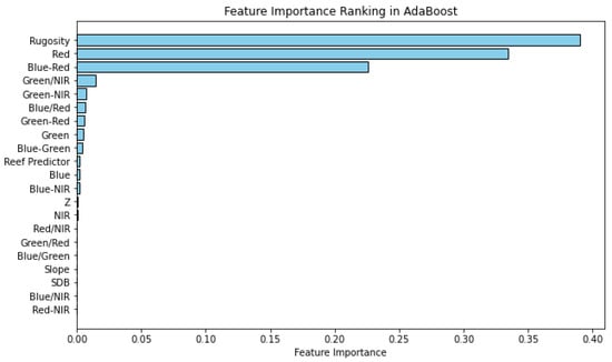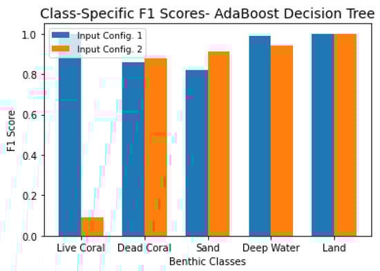 Among the models tested, AdaBoost decision trees achieved the highest classification accuracy () when trained on spectral-only data. This model performed well across most classes, with high F1 scores across all classes. We attribute its success to its ability to learn complex patterns in the data that are inaccessible to more rigid mathematical models. K-Means clustering was moderately effective but less adaptable to mixed input data. The model’s low F1 score for live coral likely reflects the sparsity of this class in the ground truth data.