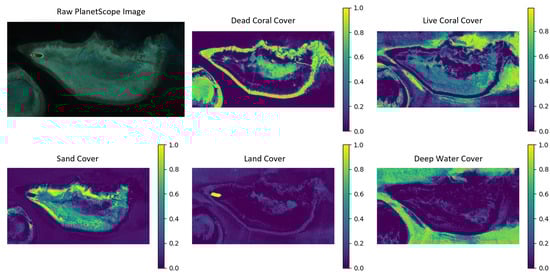 In contrast, the spectral unmixing model, while lower in overall accuracy, offers unique and powerful advantages for benthic mapping. Unlike the ML models, which produce discrete class labels, unmixing provides sub-pixel abundance estimates, offering a fundamentally richer and more ecologically realistic view of benthic composition. By quantifying the fractional coverage of each class within a pixel, the method captures fine-scale heterogeneity that conventional classifiers miss. In this region, the seafloor is patchy [53], and the unmixing method effectively captures both this patchiness and corals in deeper areas beyond the reef edge. This capability is particularly valuable for ecological assessments and long-term monitoring, where mixed-class pixels and unsampled regions are common. The resulting unmixing maps not only indicate the presence or absence of coral but also estimate percent cover, creating a baseline for more detailed habitat monitoring. Although sub-pixel validation was limited by the number of m photoquadrats, we anticipate that the model’s performance would improve substantially with more representative ground truth data, highlighting the strong potential of spectral unmixing for advancing coral reef mapping and management.