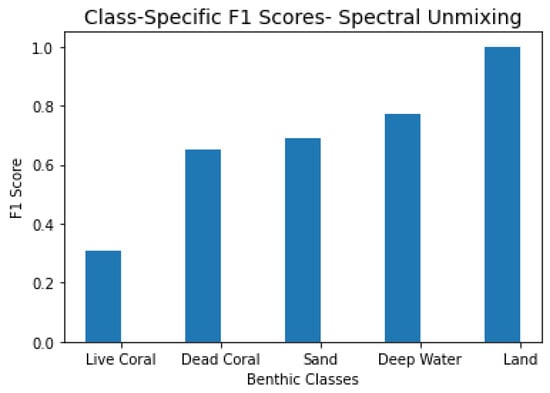 Unlike the ML models, which required a training/testing split and therefore excluded a portion of the labeled pixels from evaluation, the unmixing method does not involve training. As a result, there are a larger number of examples per class. Performance for spectral unmixing varied considerably among classes. Land was predicted nearly perfectly, with a high F1 score and only 1 pixel difference between predicted and actual counts. In contrast, sand and deep water showed much larger discrepancies in pixel counts but still achieved high F1 scores. Dead coral and live coral proved more challenging. Dead coral was substantially underpredicted, while live coral was overpredicted. Both classes had correspondingly lower F1 scores, indicating reduced reliability for these ecologically important classes.
