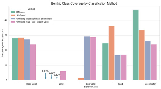 Benthic class coverage estimates are presented for the best-performing model from each classification method. The top K-Means clustering model was the semi-supervised version trained exclusively on spectral data with computed band ratios and differences. The preferred AdaBoost model, selected for its ecological plausibility, was also trained only on the spectral data. Spectral unmixing was implemented as a single model trained on spectral data with derived features.