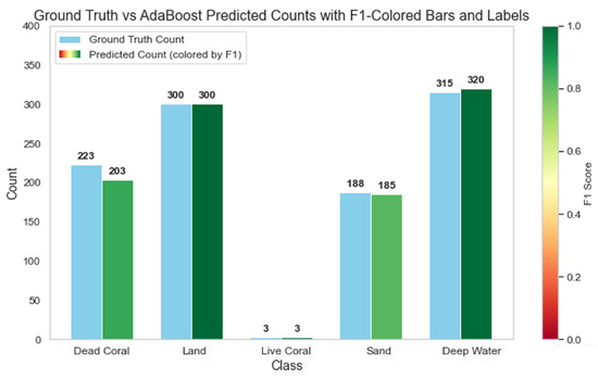 The optimal AdaBoost model performed well overall, with particularly strong agreement for land and deep water, where predicted counts closely matched the ground truth and F1 scores were high. Live coral also showed good performance, achieving a high F1 score despite its small sample size. Sand exhibited good agreement, with only a slight underestimation, while dead coral was moderately underestimated relative to the ground truth.