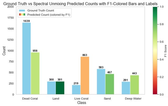 Comparison of spectral unmixing predictions and ground truth pixel counts per benthic class, color-coded by F1 score.