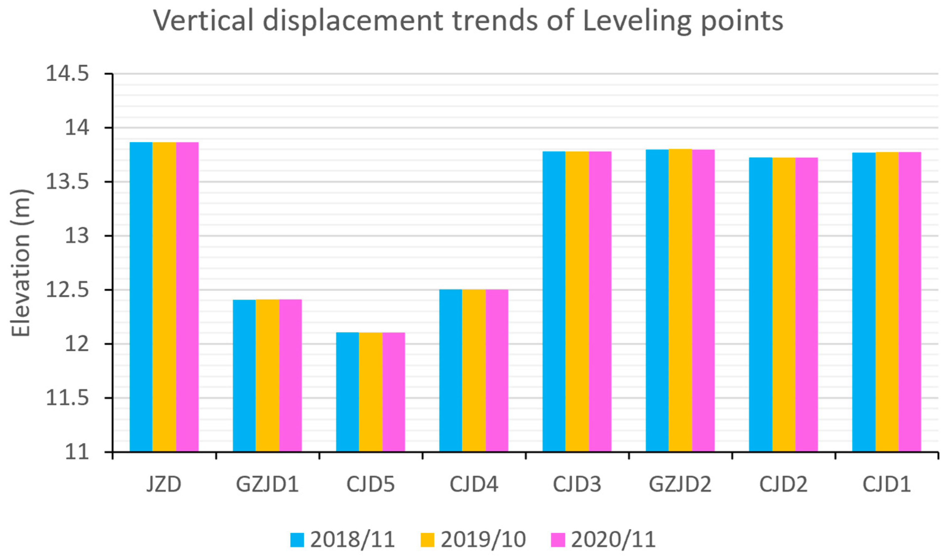 | Point Id | November 2018 Monitored Elevation (m) | October 2019 Monitored Elevation (m) | November 2020 Monitored Elevation (m) | Elevation Difference Between Phase I and II (m) | Elevation Difference Between Phase II and III (m) |