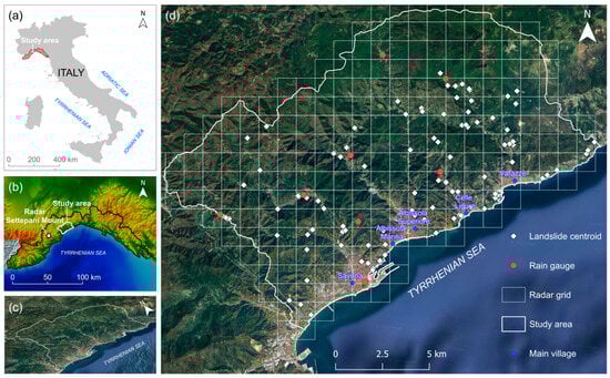 The proposed methodology was tested on a relatively small area in the Savona province, (Italy). The area is located in the central part of the Liguria Region, in north-western Italy. This area is particularly prone to instability phenomena and a rich database of rainfall-induced landslides is available. Several rain gauges are located in the chosen area, and such availability of relatively dense monitoring network makes it particularly suitable for evaluate the potential improvement provided by radar for a more accurate reconstruction of spatial rainfall patterns even in well-instrumented contexts. The region is characterized by small- to medium-sized catchments, with drainage areas ranging from 10 to 1000 km2. Rainfall events are generally short in duration, typically lasting between 0.5 and 10 h [38,39], and the hydrological regime is predominantly torrential, often associated with flash flood events [40].