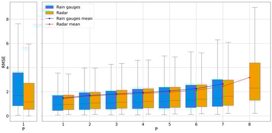 Comparison between the distributions of the mean hourly estimation error in retrieving rain gauges, using the estimator based on the remaining gauges (blue box plots) or the estimator obtained with radar data corrected with the same gauges (orange box plots), for values of ranging from 1 to 7. The final box plot at represents the error distribution obtained using the uncorrected radar product. The box on the left shows the distribution of the error in the estimate of the maximum value recorded by the rain gauge when the latter is excluded in the data correction and in the spatialization of the rain gauge data. Each box plot is derived from a dataset of 636 hourly values.