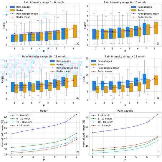 Comparison between the distributions of the mean hourly estimation error in retrieving the values of P rain gauges falling within the range indicated in each panel, using the estimator based on the remaining gauges (blue box plots) or the estimator obtained with radar data corrected with the same gauges (orange box plots), for values of ranging from 1 to 7. The final box plot at , in each panel, represents the error distribution in retrieving values within the considered range using the uncorrected radar product. The box plots are derived from 597, 272, 151, and 55 hourly values for panels (a), (b), (c), and (d), respectively. The curves superimposed on the box plots represent the mean of the corresponding distributions: in blue for the rain gauge data and in red for the radar data. In the bottom row, panels (e) and (f) these curves are normalized with respect to the mean values of the rain gauge measurements within each class, which the estimates aim to reproduce ((left) panel for the rain gauge-based estimates, (right) panel for the radar-based estimates).