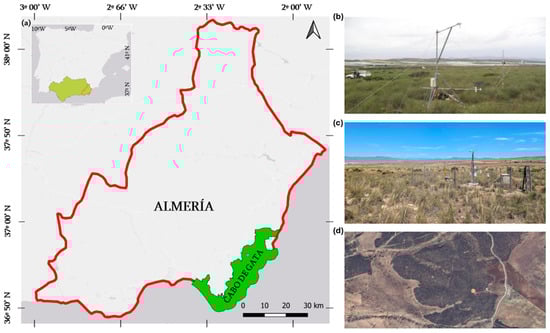 (a) Overview of Balsa Blanca grassland eddy covariance flux site situated in “Cabo de Gata-Níjar Natural Park” (green zone); (b,c) representation of zone with in situ photo; (d) visualization of satellite image obtained from GoogleMaps; red point represents localization of eddy covariance tower site, named Blasa Blanca.