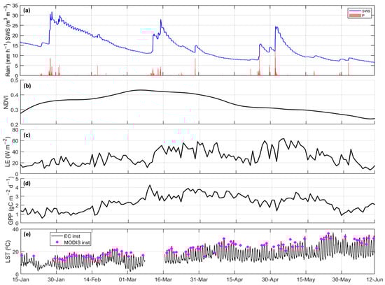 (a) Volumetric soil water content (SWC, m3·m−3) at a depth of 4 cm is represented by the blue line and precipitation is represented by the red bars (mm); (b) dynamics of Normalised Difference Vegetation Index (NDVI) during periods of analysis (half-daily data interpolated and smoothed); (c) latent heat flux (LE, evapotranspiration, W·m−2) at daily time step; (d) gross primary productivity (GPP, gC·m−2·d−1); (e) black line represents instantaneous dynamic land surface temperature (LST, °C) observed from eddy covariance (EC) tower, while magenta points represent instantaneous LST (°C) observed from Moderate Resolution Imaging Spectroradiometer (MODIS) product. From 8 March to 16 March, there is a data gap due to technical issues of the EC tower.