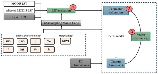 The SVEN model is a remote-sensing-based land surface model that simulates canopy radiation, energy, water, and carbon fluxes, as well as vegetation dynamics []. It builds on and expands the remote-sensing-based light use efficiency (LUE-GPP) model [,] and the Prestley–Taylor Jet Propulsion Laboratory (PT-JPL) ET model [], rendering them dynamic. The model operates at half-hourly intervals and is capable of temporal interpolation, enabling the integration of the instantaneous land surface variables, including LST, Rn, SWC, LE, and GPP, into a continuous time series.
