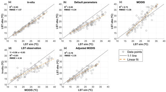 Scatterplot of simulated instantaneous LST from SVEN compared to observed LST at calibration. (a) Observed LST data obtained from in situ measurement; (b) observed data obtained from in situ LST sensor compared with simulated LST using default parameters without being calibrated; (c) observed LST data obtained from MODIS; (d) relationship between in situ and MODIS LST observation; (e) observed data obtained from adjusted MODIS product using linear regression. Grey line denotes 1:1 reference and orange dashed line denotes least-squares linear regression (best-fit).