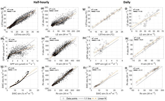 Relationship between simulated (sim) and observed data during the validation period (29 April–12 June) at half-hourly and daily time scales. Left panels (a–f) show half-hourly results, and right panels (e–l) show daily results. (a,g) Land surface temperature (LST, °C), (b,h) gross primary productivity (GPP, µ·molsC·s−1·m−2, g·C·d−1·m−2), (c,i) soil moisture (SWC, m3·m−3), (d,j) evapotranspiration or latent heat flux (LE, W·m−2), (e,k) sensible heat flux (H, W·m−2), (f,l) net radiation (Rn, W·m−2). Grey line denotes 1:1 reference and orange dashed line denotes least-squares linear regression (best-fit).