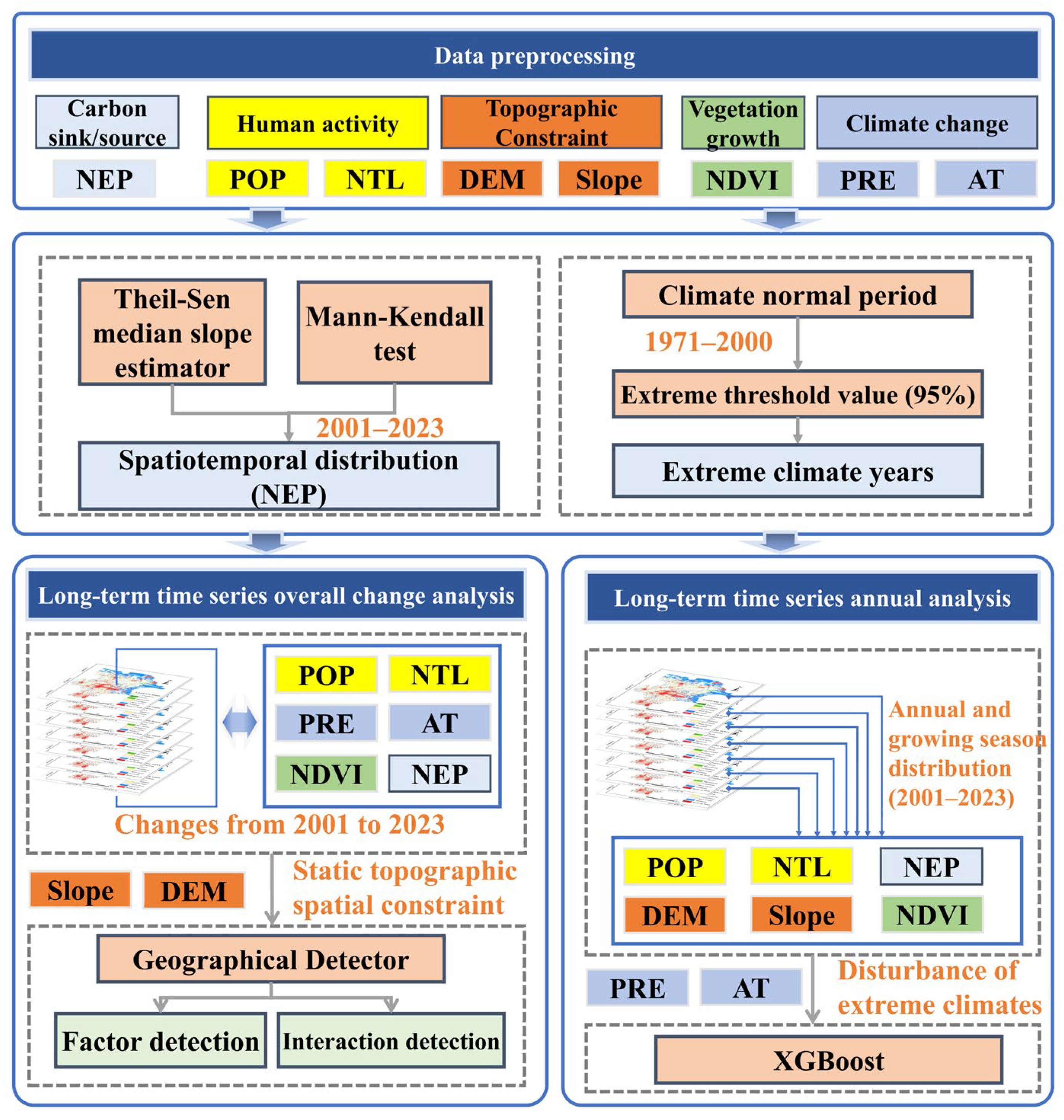 First, in the data preprocessing phase, multiple datasets are integrated, including NEP, human activity indicators (POP, NTL), topographic constraints (DEM, Slope), vegetation growth (NDVI), and climate change factors (PRE, AT). Second, the spatiotemporal distribution of NEP from 2001 to 2023 is analyzed using the Theil–Sen median slope estimator and Mann–Kendall test. Simultaneously, extreme climate years are identified by determining an extreme threshold value (95%) based on the climate normal period (typically defined as the preceding three decades adjacent to the observation period, e.g., the climate normal period for 2001–2010 is 1971–2000). Third, for the long-term time series overall change analysis, the Geographical Detector method is employed to conduct factor detection and interaction detection. This involves assessing factors highly explanatory for NEP changes from four dimensions: anthropogenic activities (POP, NTL), climate conditions (PRE, AT), vegetation growth (NDVI), and topographic features (DEM, Slope). Finally, in the long-term time series annual analysis, the annual and growing season distributions (2001–2023) of NEP and its associated factors (POP, NTL, DEM, Slope, NDVI) are examined. The XGBoost model is used to evaluate the impact of extreme climate disturbances (PRE, AT) on the dynamic changes of NEP and the contribution weights of its key factors. Meanwhile, the lag effect of climate disturbances is analyzed using the method of cross-correlation analysis.
