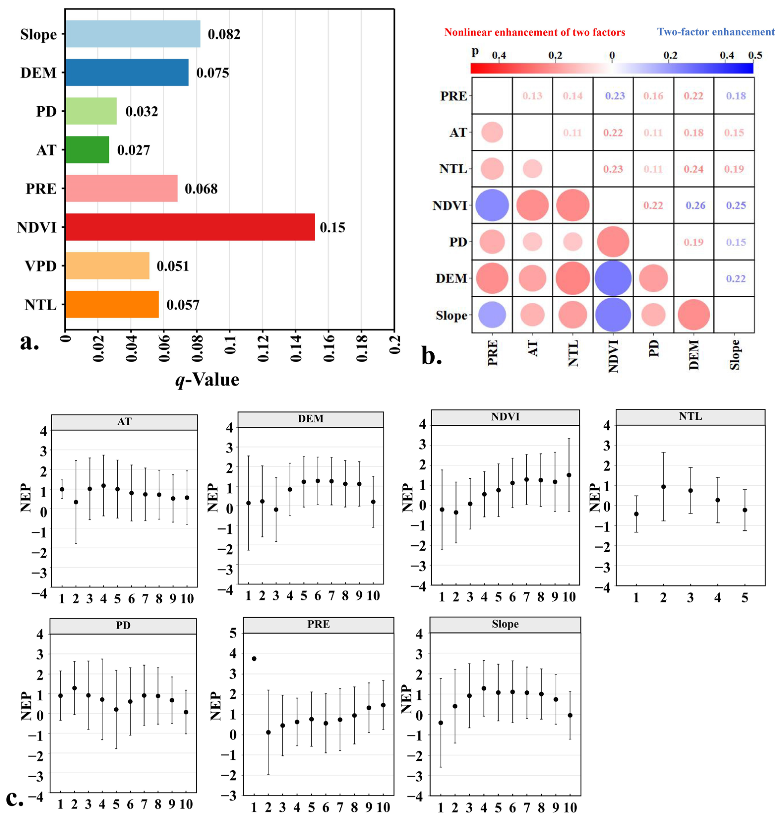 Figure 4. The analysis results of multiple explanatory factors related to NEP using Geodetector. (a) is the factor detector results showing q-values of individual explanatory factors (reflecting their explanatory significance for NEP changes), (b) is the interaction detector results illustrating interaction types between paired factors, and (c) is the risk detector results identifying zoning based on NEP heterogeneity across strata.