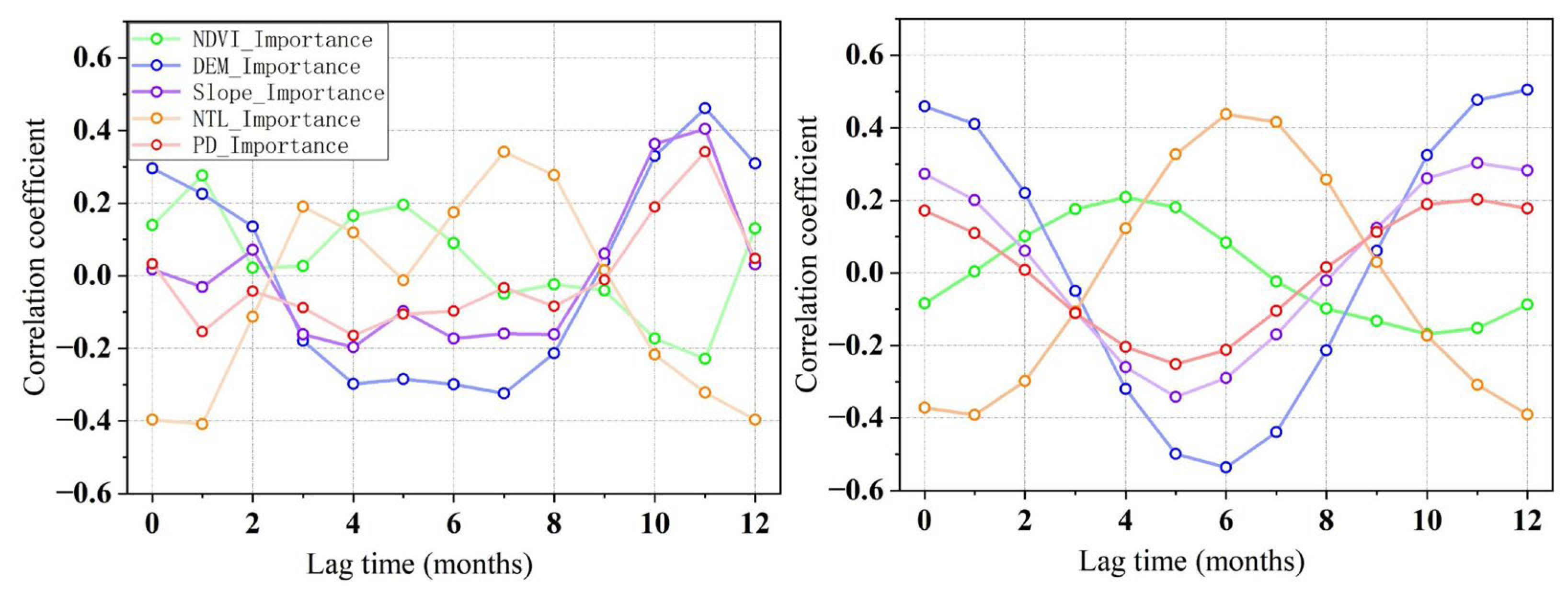 First, based on the monthly datasets of PRE, AT, NEP, and other related variables from 2001 to 2023, analysis samples with different lag periods (ranging from 0 to 12 months) were established. Here, the independent variables were PRE or AT, and the dependent variable was the feature importance results of each variable on NEP changes obtained from XGBoost analysis. Second, Pearson correlation analysis was used to analyze the cross-correlation coefficients of all samples. Finally, based on the cross-correlation results, the lag effects of precipitation and high-temperature climates on the contributions of various variables to NEP were analyzed.