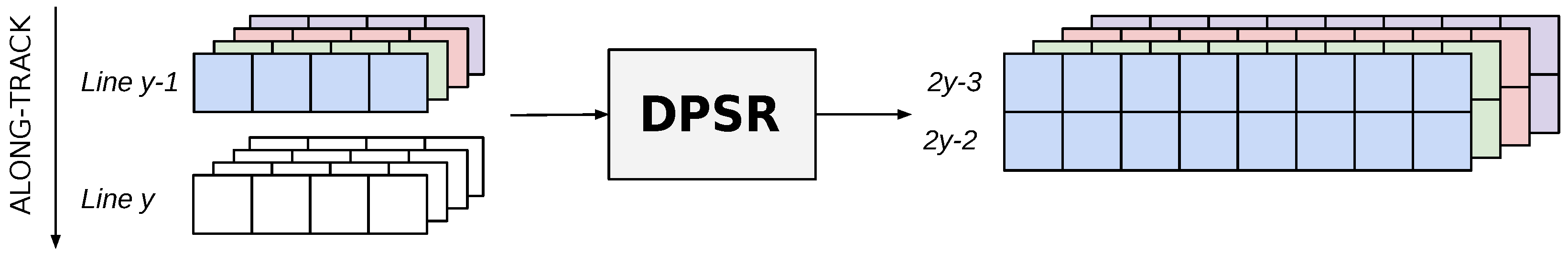 The overall design goal is to super-resolve an image line by line in the along-track direction, aiming to match a pushbroom acquisition system and minimize the memory and computational requirements. In the remainder of this paper, we will use H to denote the number of lines in the along-track direction y, W to denote the number of columns in the across-track direction x, and C to denote the number of spectral channels. We also remark that super-resolving a line, with all its spectral channels, of size by a factor r produces an output of size , i.e., r lines in the along-track direction, expanded by a factor of r in the across-track direction.