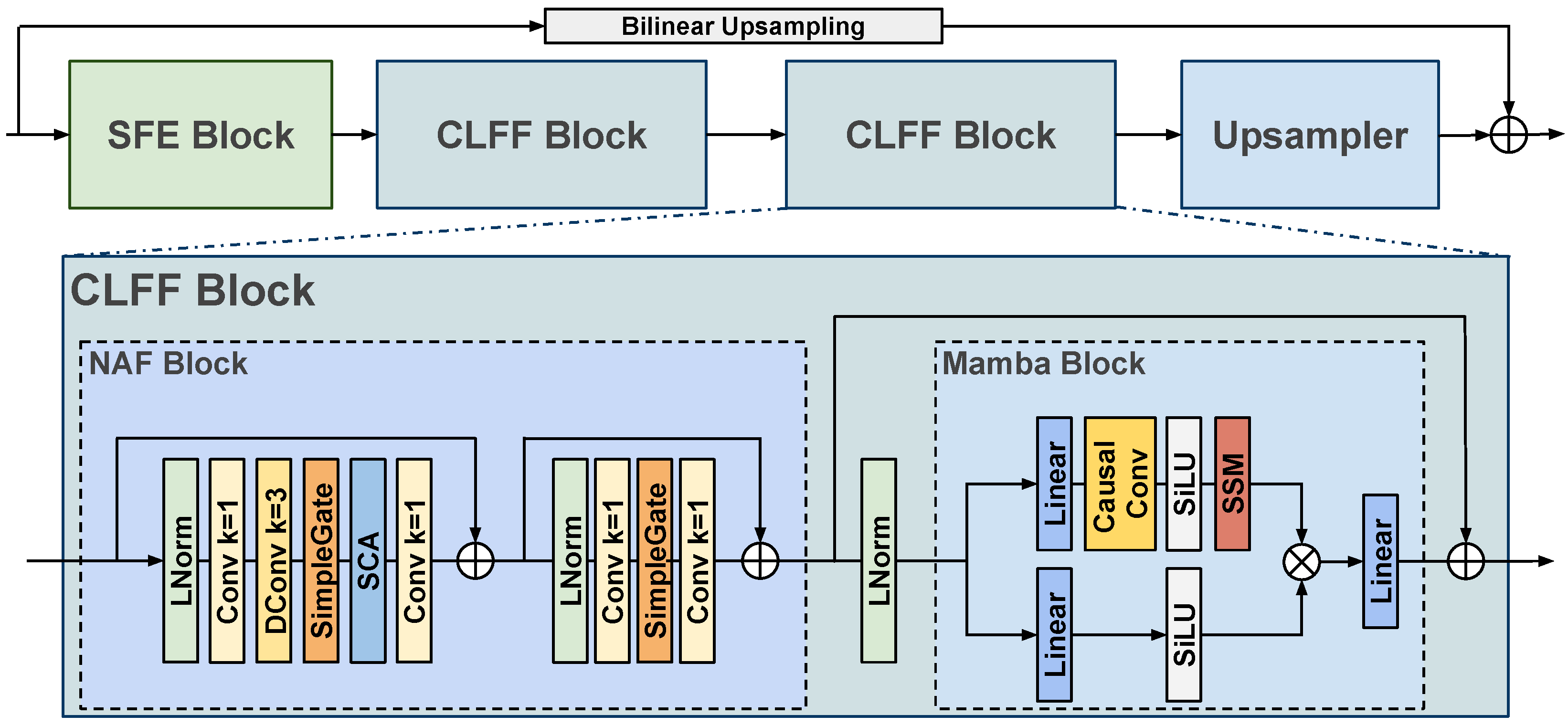, where each pixel in the across-track direction is associated with a feature vector jointly capturing correlations between the columns and the original spectral bands. The SFE block is then followed by a backbone composed of two cross-line feature fusion (CLFF) blocks, each consisting of a NAFBlock followed by a Mamba block. The design of the CLFF blocks is motivated by the different but complementary roles of the NAFBlock and Mamba block. The tensor