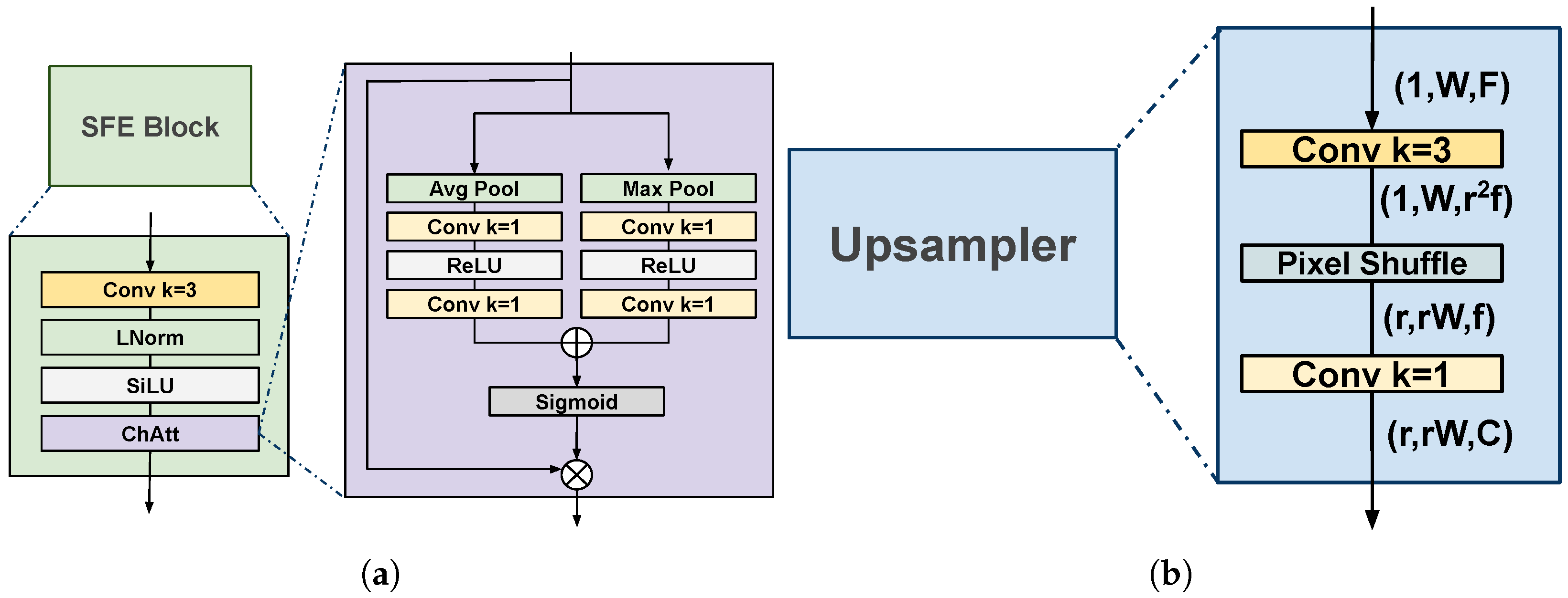 The final part of the architecture is the upsampler module, which is responsible for the output tensor having the appropriate spatial dimensions, according to the desired super-resolution scale factor. The upsampler first expands the input tensor channels with a 1D convolution to a value