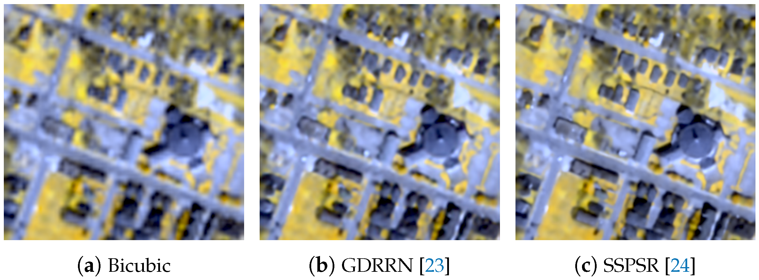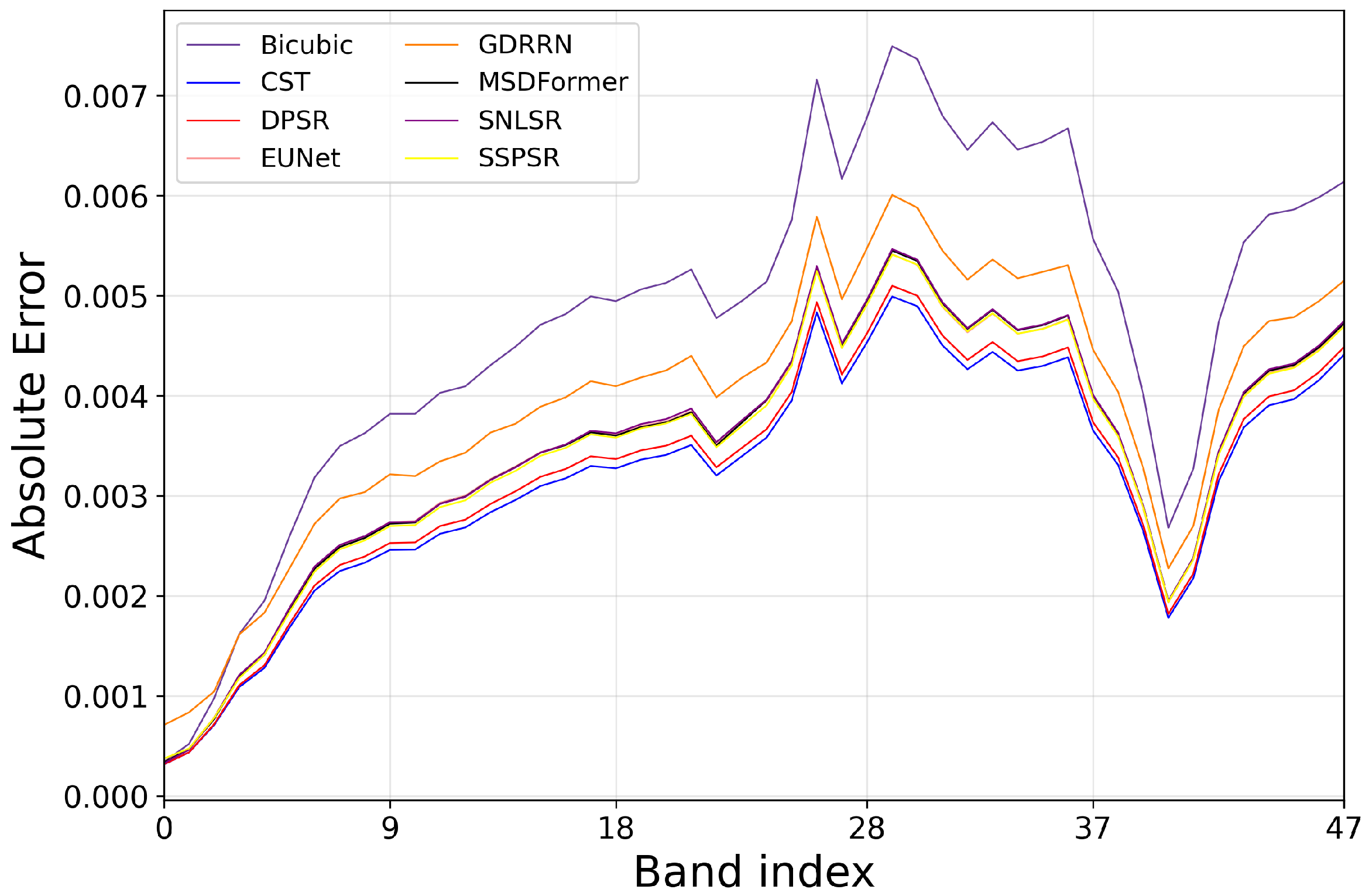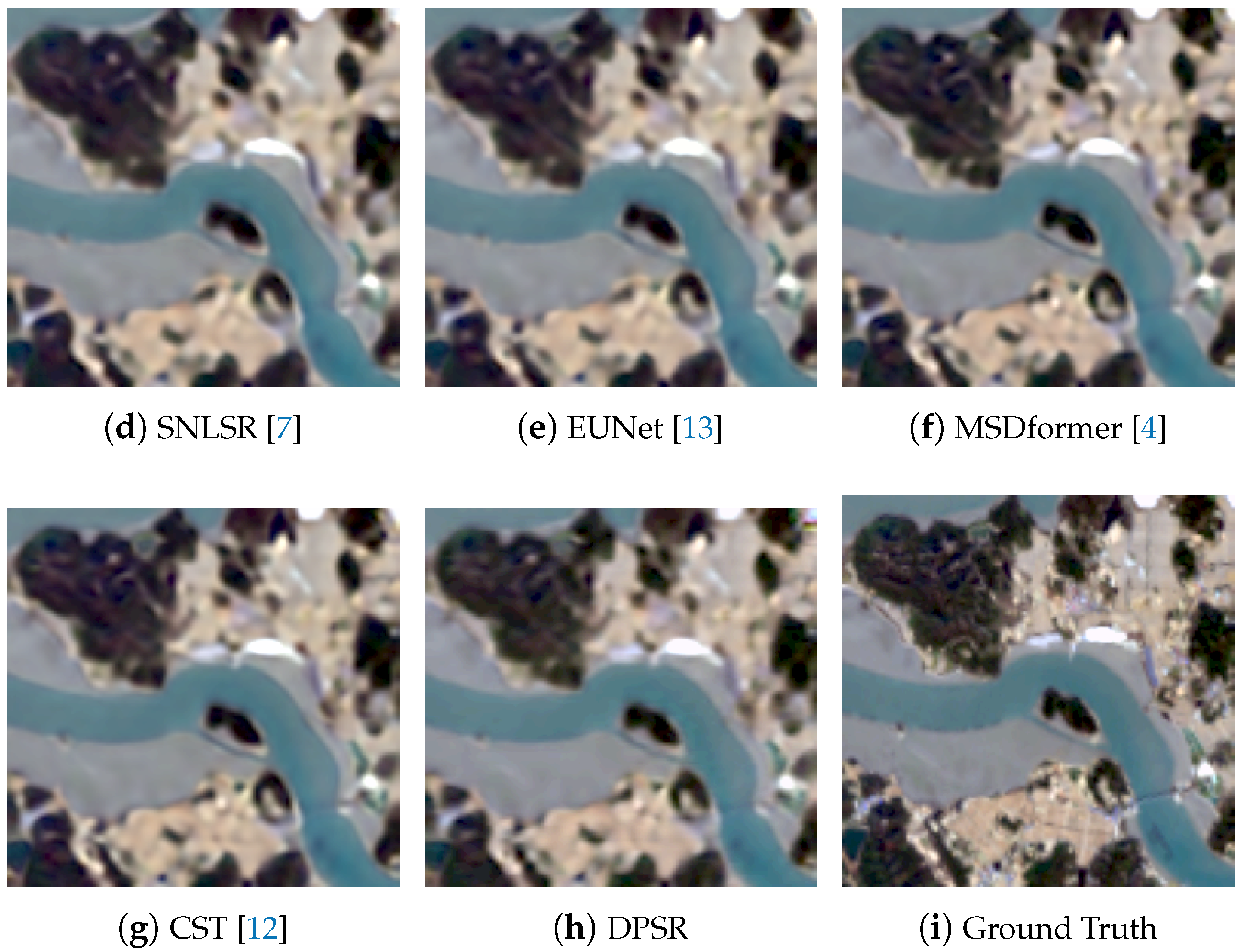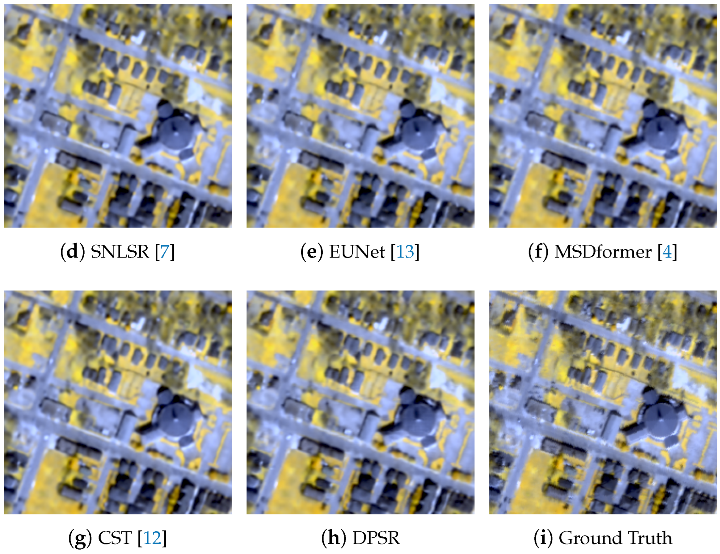 On HySpecNet-11k ( SR), DPSR achieves a 43.17 dB MPSNR with only 31 K FLOPs/px, within 0.28–0.44 dB of MSDformer and CST while being significantly lighter (e.g., 714 K and 245 K FLOPs/px for MSDformer and CST, respectively). A similar pattern holds for 2× SR. On the Chikusei, Houston, and Pavia benchmarks, DPSR is consistently competitive, often within 0.1–0.3 dB of the strongest baselines and occasionally surpassing them, while maintaining a much lower FLOPs/px profile. In urban scenes (Houston), DPSR’s gap with CST remains small at both 2× SR and 4× SR, indicating that linewise memory is effective even in highly structured environments with many details. For Pavia, the method remains close to the best scores, delivering the second-best quality metrics, only behind CST, as in Houston. These results demonstrate that the long-range along-track context captured by DPSR through Mamba’s selective memory enables the accurate reconstruction of fine spatial and spectral details.