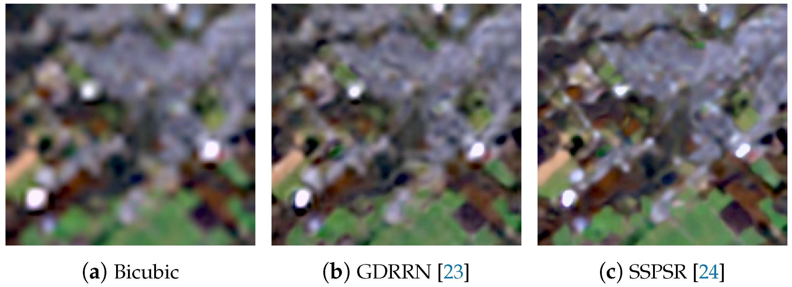 throughout all experiments. For the compact DPSR-S variant, our target was real-time operation on low-power hardware; this requirement drove the choice of internal parameters. For the full DPSR model, both the internal feature width and the Mamba expansion factor were selected to match a predefined complexity envelope (30 K FLOPs/px on HySpecNet-11k with an SR factor of 4 and 20 K FLOPs/px on the same dataset with an SR factor of 2). For the training procedure, we used the Adam optimizer with a fixed learning rate of