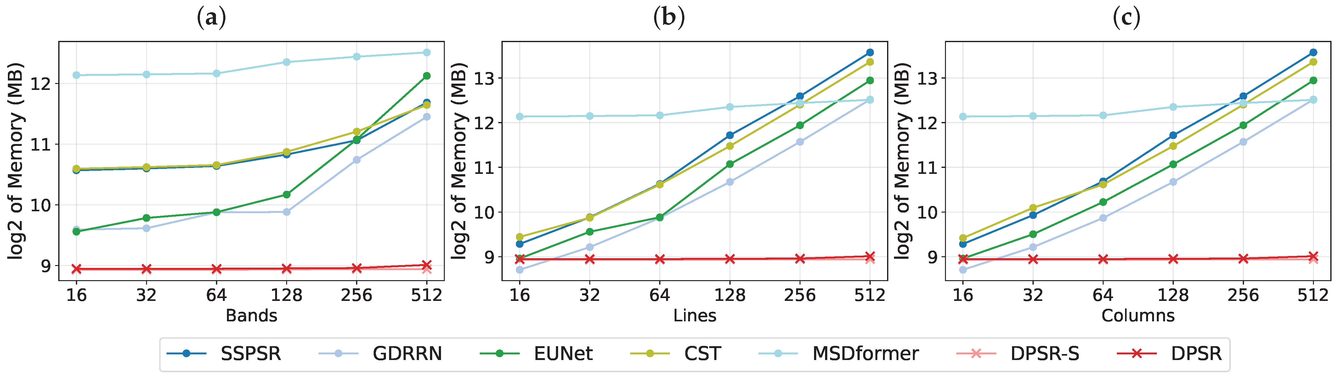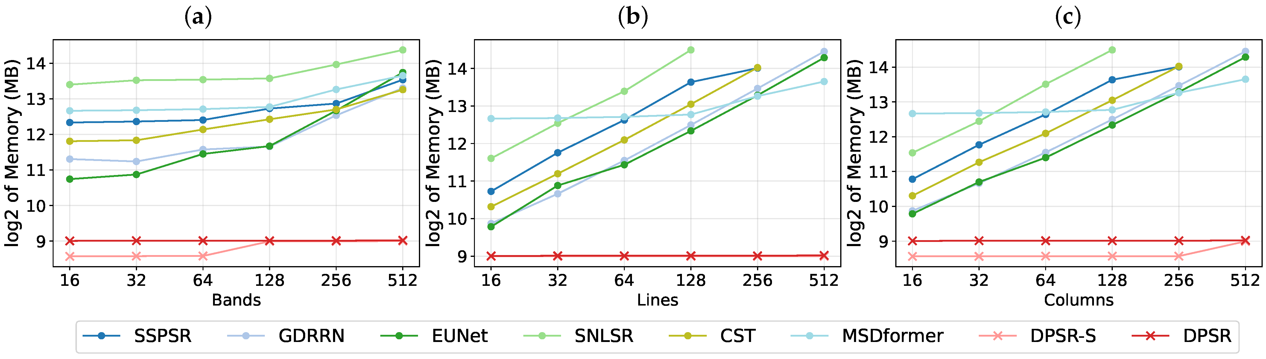 Beyond quality, the efficiency analysis reinforces the practical relevance of the design. Memory scales linearly with columns and bands and is independent of the number of lines processed, so a PRISMA-like frame of 1000 × 1000 × 66 can be super-resolved with less than 1 GB of memory, whereas several 2D counterparts exceed 24 GB for similar sizes. The runtime on an NVIDIA Jetson Orin Nano (15 W) reaches 4.25 ms/line (2× SR) and 5.70 ms/line (4× SR) for the small variant (DPSR-S), crossing the real-time threshold set by representative line times (e.g., PRISMA VNIR 4.3 ms/line). The base model remains substantially faster than state-of-the-art models and, given that our implementation is not yet hardware-optimal, future work will explore hardware-aware optimizations, such as kernel-level tuning and FPGA deployment, to further enhance the throughput.