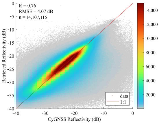The fitting performance of the forward model was assessed by applying different data rejection rules based on the quality flags of SMAP and CYGNSS. Applying the Recommended Quality flag of SMAP removed 20–40% of data over land (varying by region, season, and environmental conditions). Applying more conservative quality flags slightly improves the accuracy of the forward model estimations at the cost of an increased number of missing pixels. Table 4 summarizes the performances of the forward model under different quality filtering. The density plot of Figure 2 shows the estimated reflectivity from the forward model versus the CYGNSS reflectivity when applying the SMAP Successful Retrieval quality flag.