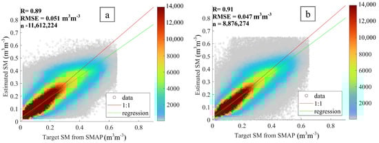 Retrieved SM from semiempirical model vs. SMAP SM (a) with SMAP Recommended Quality flag, (b) with SMAP Successful Retrieval flag.