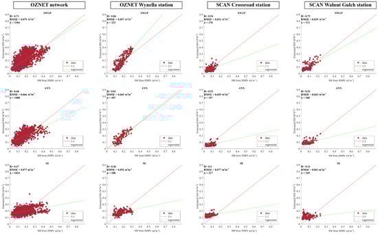 Figure 7 presents scatter plots comparing in situ soil moisture observations with estimates from SMAP, and from CYGNSS using the ANN, and the semiempirical (SE) algorithm across the OzNet and SCAN networks, including individual stations at Wynella, Crossroads, and Walnut Gulch. Overall, SMAP and ANN demonstrate comparable or superior performance to the SE model in most cases, with notable differences in correlation and error metrics across sites.