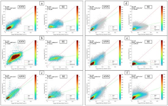 Barren areas and Subtropics-warm strata, case e, highlights a warm subtropical barren area (or very sparse vegetation), a regime where both models are highly effective and achieved low RMSEs. The ANN performed slightly better than the SE model. However, the improvement is marginal because the problem is already well-constrained by the physics of the environment. In bare soil, GNSS reflectivity has a strong, direct relationship to moisture (high signal-to-noise), which a simple linear model can capture fairly well. Finally, case f represents a tropical lowland regime characterized by meadows, mosses, and lichens land cover. In this strata, we found the highest performance improvement, 47.2% reduction in RMSE from 0.072 m3 m−3 to 0.038 m3 m−3. Again, the results highlight the ANN’s advantage in environments where the soil–moisture signal is partially obscured or distorted by biophysical layers. In such conditions, the flexibility of machine learning proves essential, capturing nuanced variations that exceed the capacity of simple empirical or linear models.