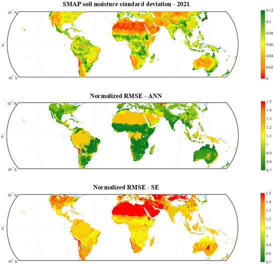 As shown in Table 11, Figure 9 provides global maps of SMAP soil moisture standard deviation and the spatial distribution of normalized RMSE for both ANN and SE models. These maps further confirm that the ANN outperforms the SE model in most regions, especially where natural variability is high and nonlinear patterns dominate. Areas where normalized RMSE > 1 indicate regimes where the model fails to capture the full dynamics of soil moisture.