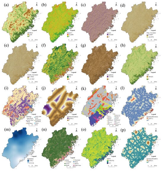 Landslide assessment factors. (a) DEM; (b) slope; (c) aspect; (d) plane curvature; (e) profile curvature; (f) relief; (g) roughness; (h) TRI; (i) lithology; (j) Distance2Fault; (k) soil; (l) Distance2River; (m) rain; (n) land use; (o) NDVI; (p) Distance2Road.