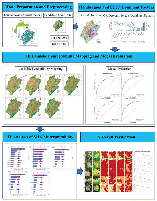 In view of the above problems, this study adopted a zoning strategy combining frequency ratio (FR), geographically weighted regression (GWR), and clustering to fully explore the spatial heterogeneity characteristics of landslide assessment factors. At the same time, with the help of Geodetector, the dominant influencing factors of landslide development at different subregions and global scales were revealed, and the explanatory power of a single influencing factor on the spatial differentiation of landslide was quantified. On this basis, an ensemble learning model was constructed to evaluate landslide susceptibility, and the interpretability of the model results was enhanced by the Shapley additive explanations (SHAP) method. Finally, small baseline subset–interferometric synthetic aperture radar (SBAS-InSAR) technology was used to invert the surface deformation characteristics to verify the accuracy of the model prediction results. The purpose of this study was to improve the prediction accuracy and reliability of landslide susceptibility assessment, and to provide scientific support for understanding the spatial differentiation mechanism of regional landslide formation so as to provide a theoretical basis and technical reference for targeted prevention and risk management of regional landslide disasters.