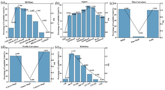 In order to reveal the law of landslide disaster triggering, we analyzed the distribution characteristics of landslide assessment factors in the study area and calculated the proportion of landslide units in different classification intervals and FR values. The larger the FR value, the more prone the area to landslide disasters in the current interval.