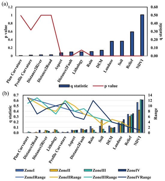 Geodetector is a statistical method based on the theory of spatial differentiation. This method quantifies the spatial stratification heterogeneity of geographic elements and identifies their driving factors through variance decomposition. The core expression of this method is that if the independent variable landslide assessment factor has an important influence on the occurrence of the dependent landslide variable, the landslide assessment factor should have similar spatial distribution characteristics to the landslide []. The q statistic of this method can assess the explanatory power of landslide assessment factors on the spatial distribution of landslides. The closer the q value is to 1, the greater the contribution of this factor to the occurrence of landslides. The formula for calculating the value of q is as follows []: