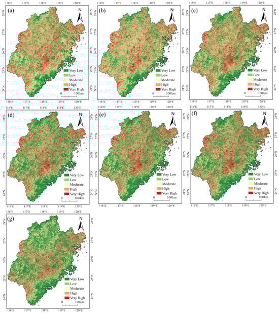 Results of landslide susceptibility mapping. (a) RF model; (b) SVM model; (c) XGBoost model; (d) stacking model; (e) GWR-S model; (f) S-Geo model; (g) GWR-S-Geo model.