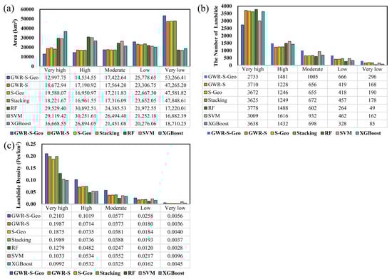 Landslide susceptibility assessment results—classification statistics. (a) Area of each susceptibility classification; (b) number of landslides in each susceptibility classification; (c) landslide density of each susceptibility classification.