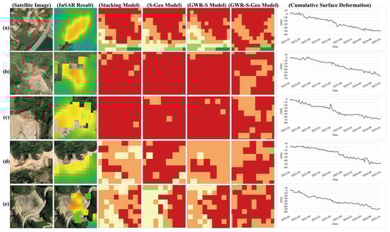 We selected several typical regions with relatively large deformation rates for analysis. By comparing the spatial coincidence degree of the high-value region of susceptibility and the region with high deformation rate and large cumulative deformation, we judged whether the results of landslide susceptibility prediction were consistent with the actual unstable region of the slope. If the degree of spatial matching of the two were high, the reliability of the susceptibility prediction results would be proved. Figure 19 shows satellite images of regions a, b, c, d, and e, as well as the corresponding displacement velocity, susceptibility results of the four ensemble models, and cumulative surface deformation variables. Compared with the other three ensemble models, the GWR-S-Geo model predicts a more accurately focused range of very high susceptibility. The a and e regions are located beside the highway. In the process of highway construction, unreasonable excavation and filling operations may destroy the stability of the original mountain, and the influence of human activities will lead to the possibility of landslides. The cumulative surface variables in region b are relatively large, and the rock and soil in this region are exposed. The lack of vegetation leads to the slope being more vulnerable to rain erosion, which in turn increases the possibility of landslides. Region c may aggravate the surface deformation during excavation for construction purposes. Excavation and engineering construction lead to a lack of local vegetation, so the risk of landslides is high. There are residents’ construction and agricultural activities in the d region. The impact of human activities leads to a large cumulative variable in the region and a high level of landslide susceptibility. The surface deformation obtained by SBAS-InSAR technology is mutually confirmed with the results of our landslide susceptibility prediction, which further proves the accuracy of the susceptibility prediction results in this study.
