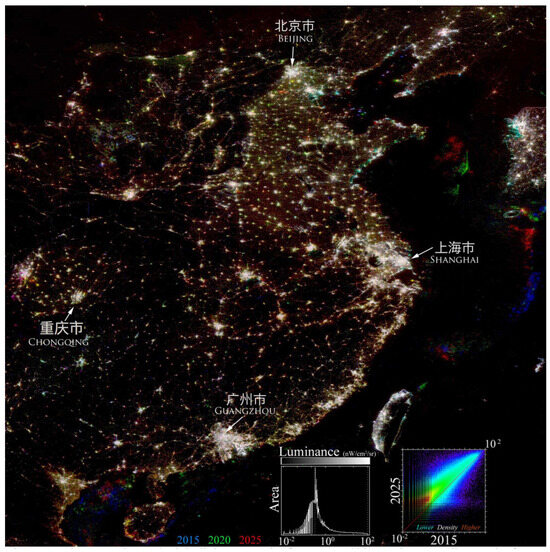 Tri-temporal VIIRS night light composite for eastern China and surroundings. Color implies change. The four study areas span urban/rural gradients of conurbations in diverse climates and landscapes. Beijing and Chongqing are located at the mountainous peripheries of agricultural basins. Shanghai and Guangzhou are located on major river deltas. While urban growth and electrification contribute to decadal brightening, background luminance (<~10−0.5 nW/cm2/sr) is more sensitive to variability in cloud cover and atmospheric scattering. Most prominent changes are associated with offshore fishing fleets.