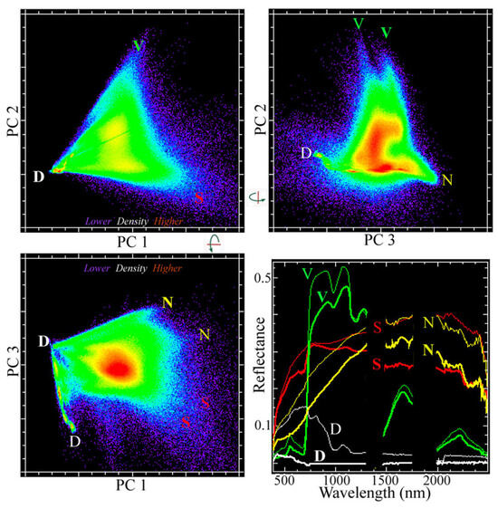 Three-dimensional PC spectral mixing space for the EMIT quadcore mosaic. Low-order PCs render the familiar triangular SVD mixing space bounded by Substrate, Vegetation and absorptive/transmissive Dark features (S, V, D labels). Non-photosynthetic vegetation (N) and sediment-laden river water (D) extend a 2D triangular space to a 3D tetrahedron. Multiple similar but distinct spectral endmembers surround each apex of the mixing space.