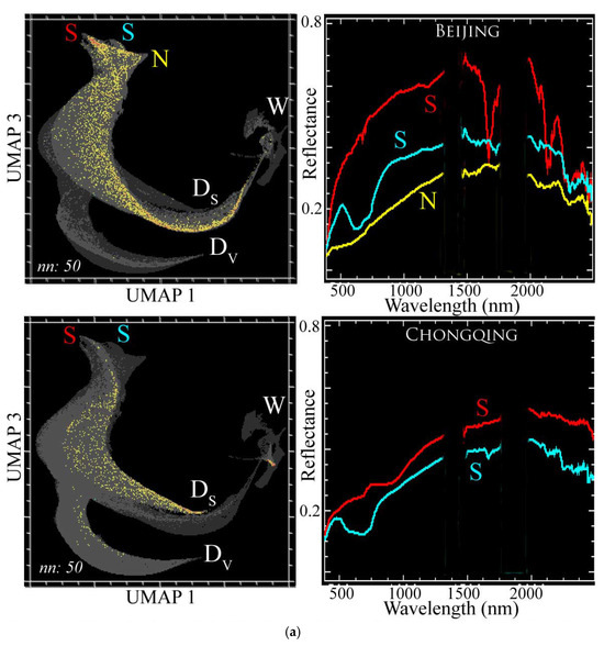 The EMIT acquisitions of each of the four study areas image gradients from the historic city centers to peri-urban environments. As such, they contain not only the dense aggregations of small buildings in the oldest parts of each city but also the larger-scale mosaics of modern high-rise construction and urban vegetation that are characteristic of recent urban expansion in China. Despite the diversity of peri-urban land covers, the high luminance urban cores of all four study areas form a single SVD-bounded mixing space in the UMAP embedding of the Sentinel-2 mosaic, as shown in Figure 12. This stands in contrast to the distinct vegetation and substrate continua found for the EMIT mosaic, also shown in Figure 12. We assume that the difference is the result of the peri-urban land covers included in the EMIT mosaic but not in the Sentinel-2 mosaic. The finer-scale urban vegetation and NPV in the urban cores are present along the peripheries of the substrate continuum of the EMIT mosaic, whereas the vegetation continuum corresponds mainly to peri-urban agriculture and forest. This suggests a fundamental difference in the effectively binary mixing of the vegetation continua and the ternary mixing of the substrate-dominant continua of the urban cores. More accurate mapping of urban vegetation may also have implications for monitoring and managing specific urban planning and environmental health challenges like the urban heat island effect and loss of green space. Also noteworthy in the UMAP mixing spaces of the individual study areas is the similarity of the Shanghai and Guangzhou spaces in contrast to the differences in the Chongqing and Beijing spaces. To some extent, the latter is a result of the winter acquisition of the Beijing granule, but this does not explain why the Chongqing space is so different from the Shanghai and Guangzhou spaces—despite the fact that all share the distinction between vegetation and substrate-dominant continua.