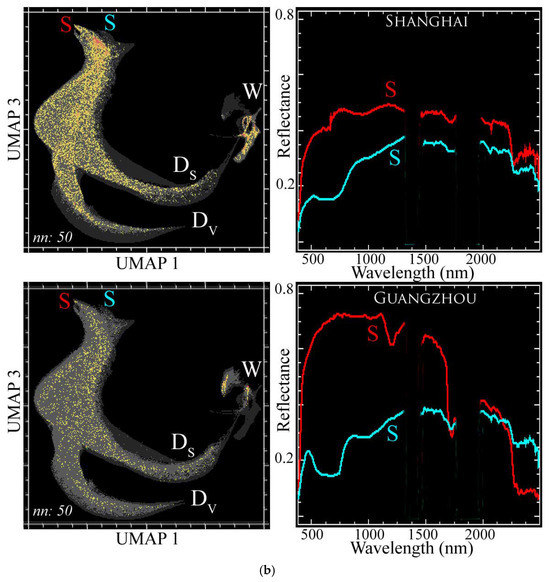 UMAP subsets for each individual city can be compared by superposition on the silhouette of the full composite mixing space. Figure 7 shows distinct topologies for each city at low near neighbor scales with each city converging to distinct substrate and vegetation continua at near neighbor scales of 50. In this and successive figures, we present UMAP embeddings from nn: 50 because it represents convergence to a common topology relative to the nn: 10 embeddings. It is apparent that Shanghai and Guangzhou share very similar topologies for both the substrate and vegetation continua, while Beijing and Chongqing have very different topologies. Despite the differences in topologies, all four cities have distinct spectral endmembers corresponding to airport runway concrete but very similar spectral endmembers for a pervasive cyan roofing material found throughout each city (Figure 8a,b). While the distinct substrate endmembers among cities are not surprising given the diversity of synthetic materials expected to be present in each city, we expect that much spectral diversity is concealed by the pervasive spectral mixing we expect to occur within EMIT’s 50 m IFOV.