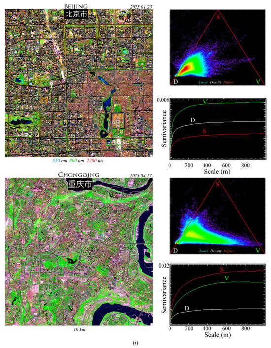(a) Full-resolution (10 m) Sentinel-2 composites, SVD fraction ternary distributions and semivariograms illustrate the characteristic scales and spectral mixing of urban core land covers for Beijing and Chongqing. Small high-density Dark fraction distribution peaks correspond to water bodies. Shadow-dominant Dark fractions (D) attain spatial semivariance sills between 100 and 300 m, quantifying pervasive spectral mixing at the 40 to 60 m resolution of the EMIT IFOV. S and V fraction sills occur at significantly larger scales. Negative fractions lie outside ternary. (b) Full-resolution (10 m) Sentinel-2 composites, SVD fraction ternary distributions and semivariograms illustrate the characteristic scales and spectral mixing of urban core land covers for Shanghai and Guangzhou. Small high-density Dark fraction distribution peaks correspond to water bodies. Shadow-dominant Dark fractions attain spatial semivariance sills between 100 and 300 m, quantifying pervasive spectral mixing at the 40 to 60 m resolution of the EMIT IFOV. S and V fraction sills occur at significantly larger scales. Negative fractions lie outside ternary. The fractal nature of the built area is more apparent at this scale than in the EMIT composites.